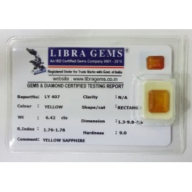 REPORT.NO.LY 407CLARITY.N/ACOLOUR.YELLOWSHAPE/CUT.RECTANGLEWT.6.42 CTSDIMENSION.1.3-9.8-4.6R.INDEX.1.76-1.78HARDNESS.9.0COMMENT.YELLOW SAPPHIRE..