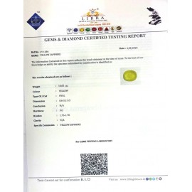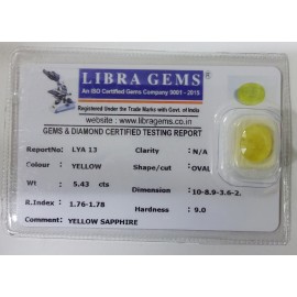 REPORT NO . LYA 13CLARITY . N/ACOLOUR . YELLOWSHAPE / CUT . OVALWT . 5.43 CTSDIMENSION . 10-8.9-3.6-2.R . INDEX . 1.76-1.78HARDNESS . 9.0COMMENT . YELLOW SAPPHIRE..
