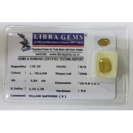 REPORT NO . LYS 30CLARITY . N/ACOLOUR . L . YELLOWSHAPE / CUT . OVALWT . 5.84 CTSDIMENSION . 10-9.8-1.6-3.R . INDEX . 1.76-1.78HARDNESS . 9.0COMMENT . YELLOW SAPPHIRE { S }..