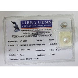 REPORT NO . LP 1055CLARITY . N/ACOLOUR . SHINING WHITESHAPE / CUT . ROUNDWT . 4.05 CTSDIMENSION . 9-1.6-5.9-1.R . INDEX . N/AHARDNESS . 3.0COMMENT . PEARL..