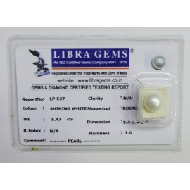 REPORT NO . LP 537CLARITY . N/ACOLOUR . SHINING WHITESHAPE / CUT . ROUNDWT . 5.47 CTSDIMENSION . 9-4.9-4.7-2.R . INDEX . N/AHARDNESS . 3.0COMMENT . PEARL..