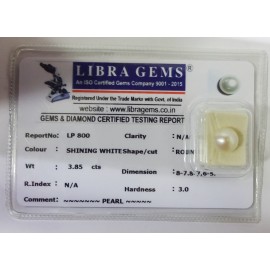 REPORT NO . LP 800CLARITY . N/ACOLOUR . SHINING WHITESHAPE / CUT . ROUNDWT . 3.85 CTSDIMENSION . 8-7.8-7.6-5.R . INDEX . N/AHARDNESS . 3.0COMMENT . PEARL..