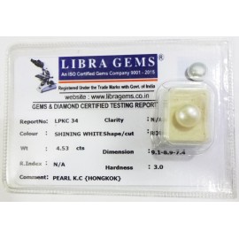REPORT.NO.-LPKC 34CLARITY.-N/ACOLOUR.-SHINING WHITESHAPE/CUT.-ROUNDWT.-4.53 CTSDIMENSION.-9-2.8-9.7-4.R.INDEX.-N/AHARDNESS.-3.0COMMENT.-PEARL K.C { HONGKOK }..