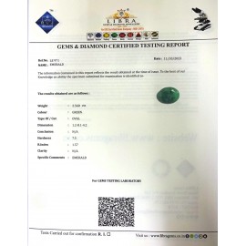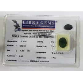 REPORT NO . LE 128CLARITY . N/ACOLOUR . GREENSHAPE / CUT . OVALWT . 3.39 CTSDIMENSION . 1-7.8-7.4-9.R . INDEX . 1.57HARDNESS . 7.5COMMENT . EMERALD..