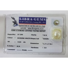 REPORT NO . LP 249CLARITY . N/ACOLOUR . SHINING WHITESHAPE / CUT . ROUNDWT . 8.64 CTSDIMENSION . 1-7.1-7.8-1.R . INDEX . N/AHARDNESS . 3.0COMMENT . PEARL..