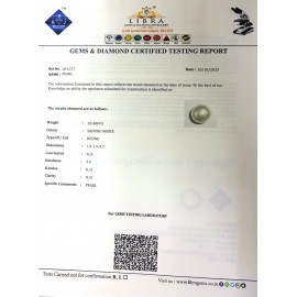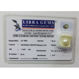 REPORT NO . LP 699CLARITY . N/ACOLOUR . SHINING WHITESHAPE / CUT . ROUNDWT . 3.65 CTSDIMENSION . 8-1.8-1.7-1.R . INDEX . N/AHARDNESS . 3.0COMMENT . PEARL..