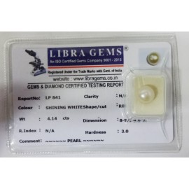 REPORT NO . LP 841CLARITY . N/ACOLOUR . SHINING WHITESHAPE / CUT . ROUNDWT . 4.14 CTSDIMENSION . 8-9.6-9.8-9.R . INDEX . N/AHARDNESS . 3.0COMMENT . PEARL..