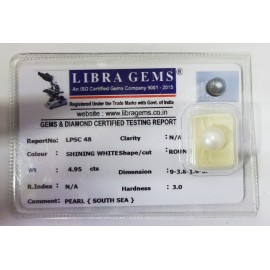 REPORT NO . LPSC 48CLARITY . N/ACOLOUR . SHINING WHITESHAPE / CUT . ROUNDWT . 4.95 CTSDIMENSION . 9-3.8-1.9-3.R . INDEX . N/AHARDNESS . 3.0COMMENT . PEARL { SOUTH SEA }..