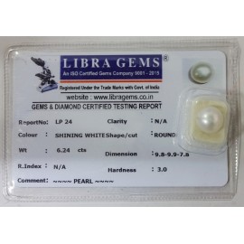 REPORT NO . LP 24CLARITY . N/ACOLOUR . SHINING WHITESHAPE / CUT . ROUNDWT . 6.24 CTSDIMENSION . 9-8.9-9.7-8.R . INDEX . N/AHARDNESS . 3.0COMMENT . PEARL..