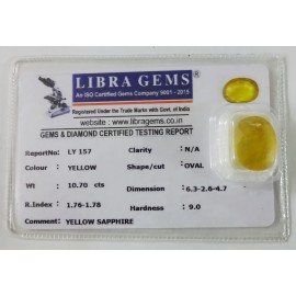 REPORT NO . LY 157CLARITY . N/ACOLOUR . YELLOWSHAPE / CUT . OVALWT . 10.70 CTSDIMENSION . 6-3.2-6.4-7.R . INDEX . 1.76-1.78HARDNESS . 9.0COMMENT . YELLOW SAPPHIRE..