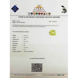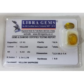 REPORT NO . LY 41CLARITY . N/ACOLOUR . YELLOWSHAPE / CUT . OVALWT . 9.32 CTSDIMENSION . 2-2.10-1.7-4.R . INDEX .1.76-1.78HARDNESS . 9.0COMMENT . YELLOW SAPPHIRE..