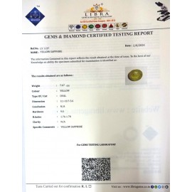 DATE: 9-4-2025REF.NO: LY 1709NAME: YELLOW SAPPHIREWEIGHT: 8.07 CTSCOLOUR: YELLOWTYPE OF/CUT: OVALDIMENSION: 4.1-1.6-5.2/CONCLUSION: N/AHARDNESS: 9.0R.INDEX: 1.76-1.78CLARITY: N/ASPECIFIC COMMENTS: YEL..
