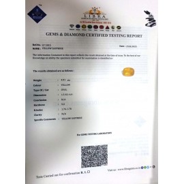 REPORT.NO.LYA 237CLARITY.N/ACOLOUR.YELLOW SHAPE/CUT.OVAL WT.4.54 CTS DIMENSION.1.2-8.3-5.3R.INDEX.1.76-1.78HARDNESS.9.0COMMENT.YELLOW SAPPHIRE {A}..