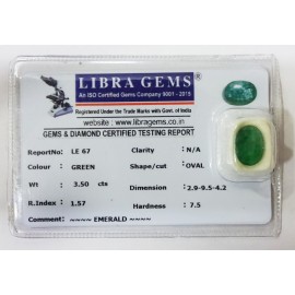REPORT NO . LE 67CLARITY . N/ACOLOUR . GREENSHAPE / CUT . OVALWT . 3.50 CTSDIMENSION . 2-9.9-5.4-2.R . INDEX . 1.57HARDNESS . 7.5COMMENT . EMERALD..