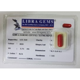 REPORT NO . LCI 310CLARITY . N/ACOLOUR . REDSHAPE / CUT . CAPSULEWT . 3.71 CTSDIMENSION . 4-7.5-6.4-1.R . INDEX . N/AHARDNESS . 3.5COMMENT . CORAL..
