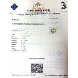 DATE:12-10-2023REF.NO:LP 1228NAME:PEARLWEIGHT:4.12 CTSCOLOUR:SHINING WHITETYPE OF/CUT:ROUND DIMENSION:9.1-9.1-6.5CONCLUSION:N/AHARDNESS:3.0R.INDEX:N/ACLARITY:N/ASPECIFIC COMMENTS:PEARL..