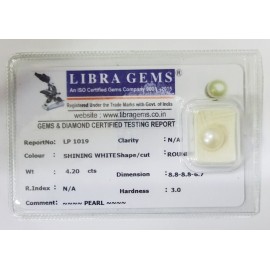 REPORT NO. LP 1019CLARITY. N/ACOLOUR. SHINING WHITESHAPE/CUT. ROUNDWT. 4.20 CTSDIMENSION. 8.8-8.8-6.7R.INDEX. N/AHARDNESS. 3.0COMMENT. PEARL..