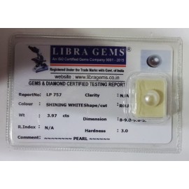 REPORT NO . LP 757CLARITY . N/ACOLOUR . SHINING WHITESHAPE / CUT . ROUNDWT . 3.97 CTSDIMENSION . 8-9.8-9.6-5.R . INDEX . N/AHARDNESS . 3.0COMMENT . PEARL..
