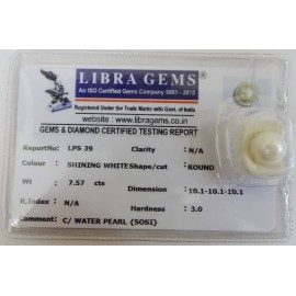 REPORT NO . LPS 39CLARITY . N/ACOLOUR . SHINING WHITESHAPE / CUT . ROUNDWT . 7.57 CTSDIMENSION . 10-1.10-1.10-1.R . INDEX . N/AHARDNESS . 3.0COMMENT . C / WATER PEARL { SOSI }..