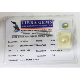 REPORT NO . LP 1116CLARITY . N/ACOLOUR . SHINING WHITESHAPE / CUT . ROUNDWT . 4.09 CTSDIMENSION . 8-9.6-6.8-9.R . INDEX . N/AHARDNESS . 3.0COMMENT . PEARL..