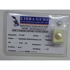 REPORT NO . LP 549CLARITY . N/ACOLOUR . SHINING WHITESHAPE / CUT . ROUNDWT . 4.63 CTSDIMENSION . 9-5.9-3.6-2.R . INDEX . N/AHARDNESS . 3.0COMMENT . PEARL..