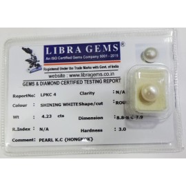 REPORT.NO.-LPKC 4CLARITY.-N/ACOLOUR.-SHINING WHITESHAPE/CUT.-ROUNDWT.-4.23 CTSDIMENSION.-8-8.8-6.7-9.R.INDEX.-N/AHARDNESS.-3.0COMMENT.-PEARL K.C { HONGKOK }..