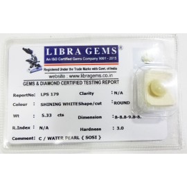 REPORT NO . LPS 179CLARITY . N/ACOLOUR . SHINING WHITESHAPE / CUT . ROUNDWT . 5.33 CTSDIMENSION . 8-8.8-9.8-8.R . INDEX . N/AHARDNESS . 3.0COMMENT . C / WATER PEARL { SOSI }..