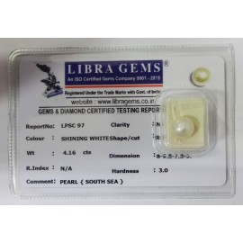 REPORT NO . LPSC 97CLARITY . N/ACOLOUR . SHINING WHITESHAPE / CUT . ROUNDWT . 4.16 CTSDIMENSION . 8-9.8-7.8-9.R . INDEX . N/AHARDNESS . 3.0COMMENT . PEARL { SOUTH SEA }..