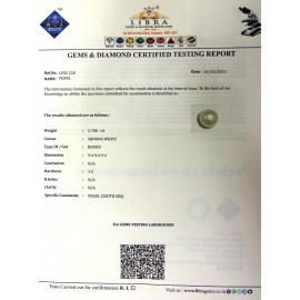 REPORT NO . LP 111CLARITY . N/ACOLOUR . SHINING WHITESHAPE / CUT . ROUNDWT . 5.90 CTSDIMENSION . 10-1.10-1.7-4.R . INDEX . N/AHARDNESS . 3.0COMMENT . PEARL..