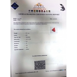 REPORT NO . LCI 386CLARITY . N/ACOLOUR . REDSHAPE / CUT . TRIANGLEWT . 3.52 CTSDIMENSION . 2-6.1-3.4-1.R . INDEX . N/AHARDNESS . 3.5COMMENT . CORAL..