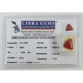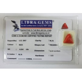 REPORT NO . LCI 397CLARITY . N/ACOLOUR . REDSHAPE / CUT . TRIANGLEWT . 4.84 CTSDIMENSION . 1-5.1-2.6-1.R . INDEX . N/AHARDNESS . 3.5COMMENT . CORAL..