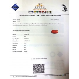 REPORT NO . LCI 235CLARITY . N/ACOLOUR . REDSHAPE / CUT . CAPSULEWT . 3.83 CTSDIMENSION . 6-8.5-9.4-7.R . INDEX . N/AHARDNESS . 3.5COMMENT . CORAL..