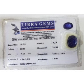 DATE: 10-4-2025REF.NO: LNA 125NAME: BLUE SAPPHIREWEIGHT: 7.89 CTSCOLOUR: L.BLUETYPE OF/CUT: OVALDIMENSION: 1.9-9.9-7.6/CONCLUSION: N/AHARDNESS: 9.0R.INDEX: 1.76-1.78CLARITY: N/ASPECIFIC COMMENTS: BLUE..