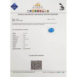DATE:2-7-2024REF.NO:LN 1265NAME:BLUE SAPPHIREWEIGHT:6.10 CTSCOLOUR:BLUETYPE OF/CUT:OVALDIMENSION:10.9-9.5-6.9CONCLUSION:N/AHARDNESS:9.0R.INDEX:1.76-1.78CLARITY:N/ASPECIFIC COMMENTS:BLUE SAPP..