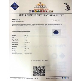 REPORT.NO.LN 840CLARITY.N/ACOLOUR.BLUESHAPE/CUT.OVALWT.8.62 CTSDIMENSION.1.3-10.3-7.6R.INDEX.1.76-1.78HARDNESS.9.0COMMENT.BLUE SAPPHIRE..