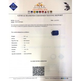 DATE:14-9-2023REF.NO:LN 988NAME:BLUE SAPPHIREWEIGHT:4.55 CTSCOLOUR:BLUE TYPE OF/CUT:OVALDIMENSION:9.4-7.8-6.4CONCLUSION:N/AHARDNESS:9.0R.INDEX:1.76-1.78CLARITY:N/ASPECIFIC COMMENTS:BLUE..