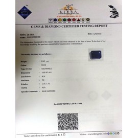 REPORT.NO.-LN 812CLARITY.-N/ACOLOUR.-BLUESHAPE/CUT.-RECTANGLEWT.-13.46 CTSDIMENSION.-4-6.9-1.7-5.R.INDEX.-1.76-1.78HARDNESS.-9.0COMMENT.-BLUE SAPPHIRE..
