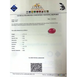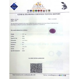 REPORT.NO. LRA 29CLARITY. N/ACOLOUR. PINKSHAPE/CUT. OVALWT. 4.22 CTSDIMENSION. 1.1-8.3-4.4R.INDEX 1.76-1.78HARDNESS. 9.0COMMENT. RUBY {A}..