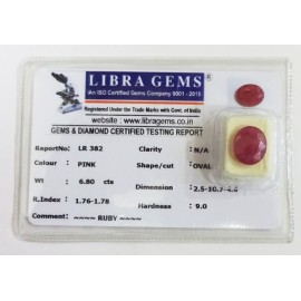REPORT.NO.-LR 382CLARITY.-N/ACOLOUR.-PINKSHAPE/CUT.-OVALWT.-6.80 CTSDIMENSION.-2-5.10-7.4-6.R.INDEX.-1.76-1.78HARDNESS.-9.0COMMENT.-RUBY..