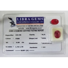 REPORT.NO.-LRA 86CLARITY.-N/ACOLOUR.-PINKSHAPE/CUT.-OVALWT.-4.60 CTSDIMENSION.-10.8-8.4-6.1R.INDEX.-1.76-1.78HARDNESS.-9.0COMMENT.-RUBY{A}..