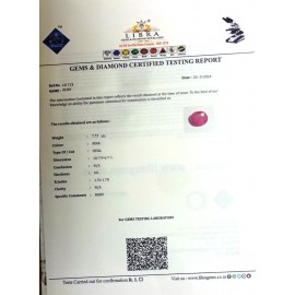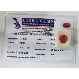 REPORT NO . LR 163CLARITY . N/ACOLOUR . PINKSHAPE / CUT . OVALWT . 4.82 CTSDIMENSION . 10-2.8-7.5-3.R . INDEX . 1.76-1.78HARDNESS . 9.0COMMENT . RUBY..