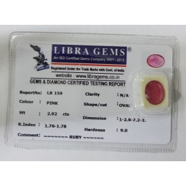 REPORT NO . LR 159CLARITY . N/ACOLOUR . PINKSHAPE / CUT . OVALWT . 2.92 CTSDIMENSION . 1-2.9-7.2-3.R . INDEX . 1.76-1.78HARDNESS . 9.0COMMENT . RUBY ..