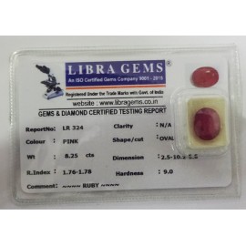 REPORT.NO.-LR 324CLARITY.-N/ACOLOUR.-PINKSHAPE/CUT.-OVALWT.-8.25 CTSDIMENSION.-2.5-10.2-5.6R.INDEX.-1.76-1.78HARDNESS.-9.0COMMENT.-RUBY..