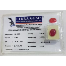 REPORT.NO.LR 460CLARITY.N/ACOLOUR.PINKSHAPE/CUT.OVALWT.3.20 CTSDIMENSION.9.5-7.9-4.1R.INDEX.1.76-1.78HARDNESS.9.0COMMENT.RUBY..