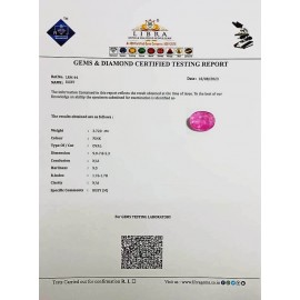 DATE:18-8-2023REF.NO:LRM 44NAME:RUBYWEIGHT:3.72 CTSCOLOUR:PINKTYPE OF/CUT:OVALDIMENSION:9-9.7-8.5-3.CONCLUSION:N/AHARDNESS:9.0R.INDEX:1.76-1.78CLARITY:N/ASPECIFIC COMMENTS: RUBY { M }..
