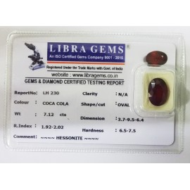 REPORT.NO.-LH 230CLARITY.-N/ACOLOUR.-COCA COLASHAPE/CUT.-OVALWT.-7.12 CTSDIMENSION.-3.7-9.5-6.4R.INDEX.-1.92-2.02HARDNESS.-6.5-7.5COMMENT.-HESSONITE..