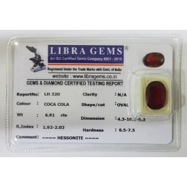 REPORT.NO.-LH 320CLARITY.-N/ACOLOUR.-COCA COLASHAPE/CUT.-OVALWT.-6.91 CTSDIMENSION.-4-3.10-3.5-3.R.INDEX.-1.92-2.02HARDNESS.-6.5-7.5COMMENT.-HESSONITE..