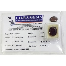 REPORT.NO.LH 517CLARITY.N/ACOLOUR.COCA COLASHAPE/CUT.OVALWT.7.10 CTSDIMENSION.1.8-9.8-6.8R.INDEX.1.92-2.02HARDNESS.6.5-7.5COMMENT.HESSONITE..