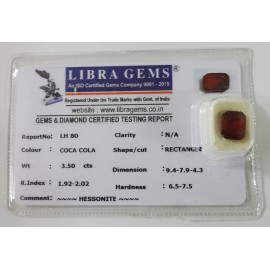 REPORT NO . LH 80CLARITY . N/ACOLOUR . COCA COLASHAPE / CUT . RECTANGLEWT . 3.50 CTSDIMENSION . 9-4.7-9.4-3.R . INDEX . 1.92-2.02HARDNESS . 6.5-7.5COMMENT . HESSONITE..