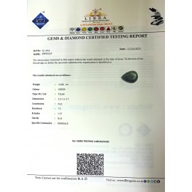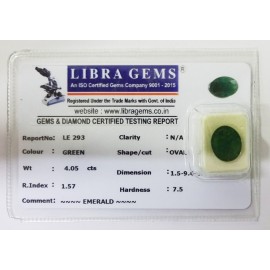 REPORT.NO.-LE 293CLARITY.-N/ACOLOUR.-GREENSHAPE/CUT.-OVALWT.-4.05 CTSDIMENSION.-1.5-9.4-5.9R.INDEX.-1.57HARDNESS.-7.5COMMENT.-EMERALD..